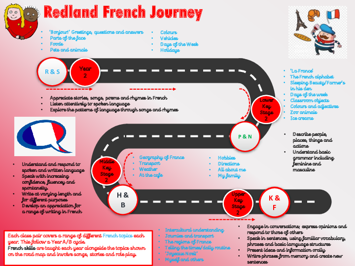 French is taught to children in Year 2 to Year 6 by Madame Webber in weekly sessions lasting 30 minutes. The language learning journey starts with rhymes, songs, games and vocabulary, and progresses to structured sentences, both verbal and written, including grammar rules, as the children reach Year 6. The children are encouraged to speak and read in French during lessons.