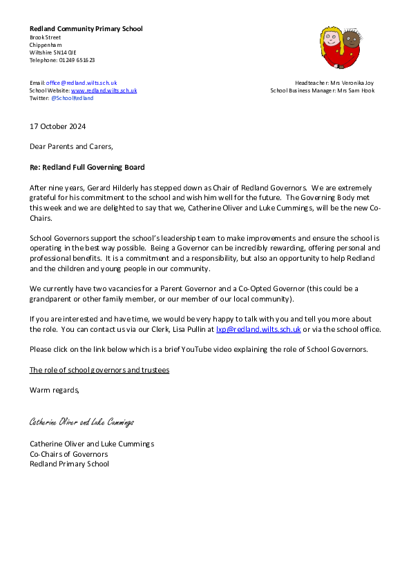 Redland School Governing body is responsible for working with the school to ensure that it delivers a good quality education. Together with the headteacher, who is responsible for day-to-day management, they set the school’s aims and policies.
