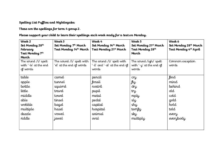 Spelling Lists for Group 2 Term 4